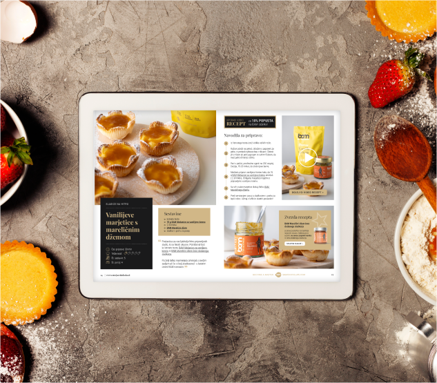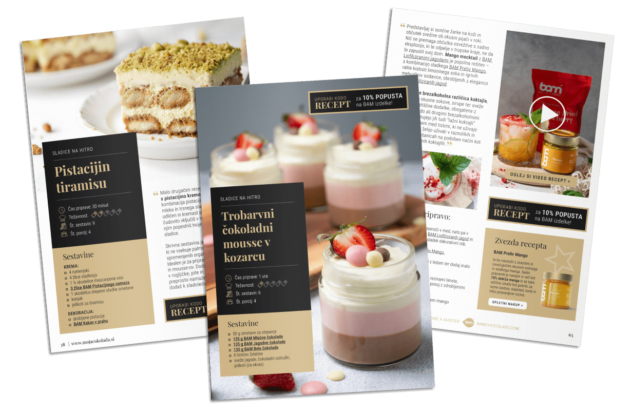 Svaki recept je detaljno opisan, od sastojaka do procesa pripreme, kako bi pečenje bilo jednostavno i zabavno. Većina recepata sadrži interaktivne poveznice na video recepte koji vas korak po korak vode do savršenog deserta. Zvijezde recepata su, naravno, vrhunski BAM proizvodi koji daju završnicu svakom zalogaju. Kako bi vaša kreacija bila još bezbrižnija, većinu slatkih sastojaka možete jednostavno naručiti upravo putem naše web stranice. I to uz poseban popust od 10%!