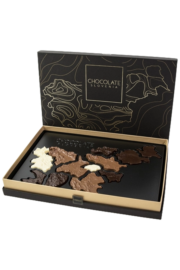 Čokoladna Slovenija svojim vrhunskim izgledom i izvrsnim okusom uvjeriti i one najzahtjevnije. Ručno izrađena čokolada u obliku Slovenije posebna je zahvaljujući pažljivo izbranim dodacima i reljefnom obliku, a zapakirana u lijepu crnu ambalažu sa zlatnim detaljima pruža prestižan izgled koji oduševljava.