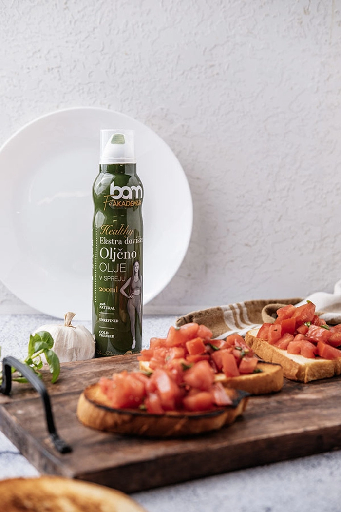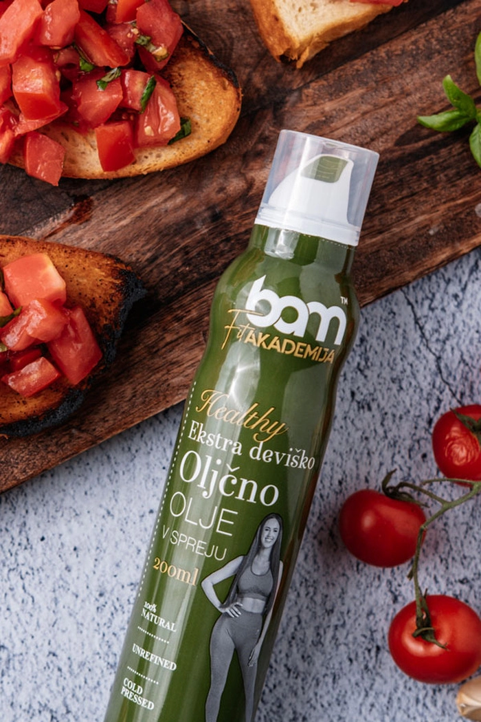 BAM ekstra djevičansko maslinovo ulje u spreju (200 ml) nježne je zelene boje, a svojim mirisom vodi u ljeto, u maslinike i svježe pokošenu travu. Domaće maslinovo ulje, ugodnog, blago gorkastog okusa masline, dočarava sočnost i autohtonost slovenske Istre. Ne zovu uzalud maslinovo ulje tekućim zlatom Mediterana. Njegove prednosti su što je lako probavljiv, snižava razinu kolesterola u tijelu i sadrži mnogo antioksidansa, zbog čega se svrstava u zdrave masnoće.