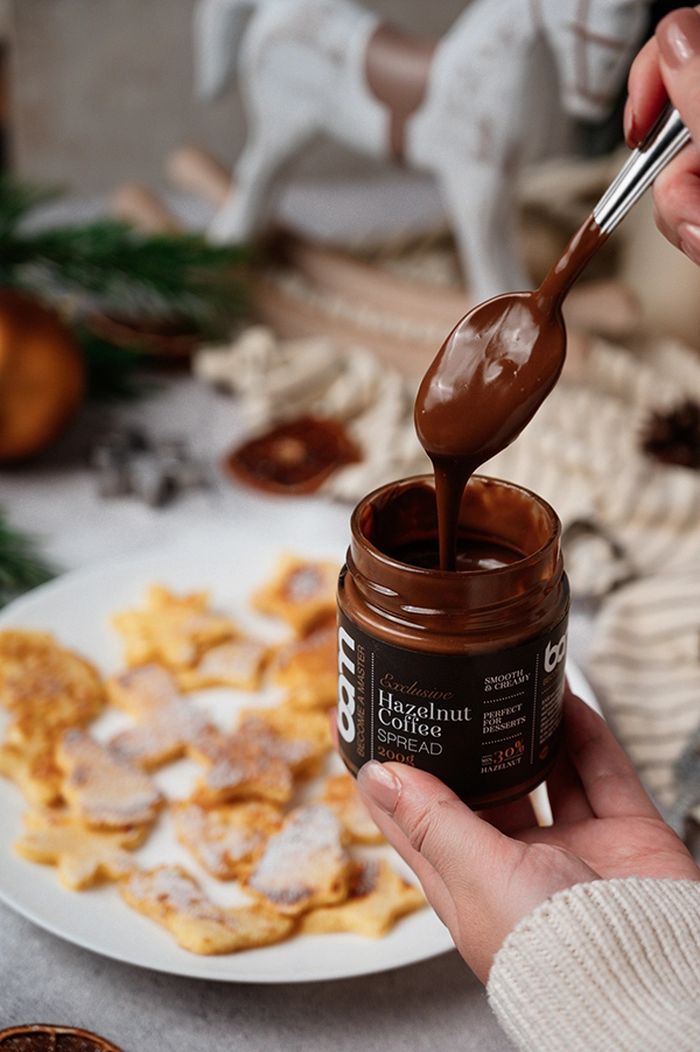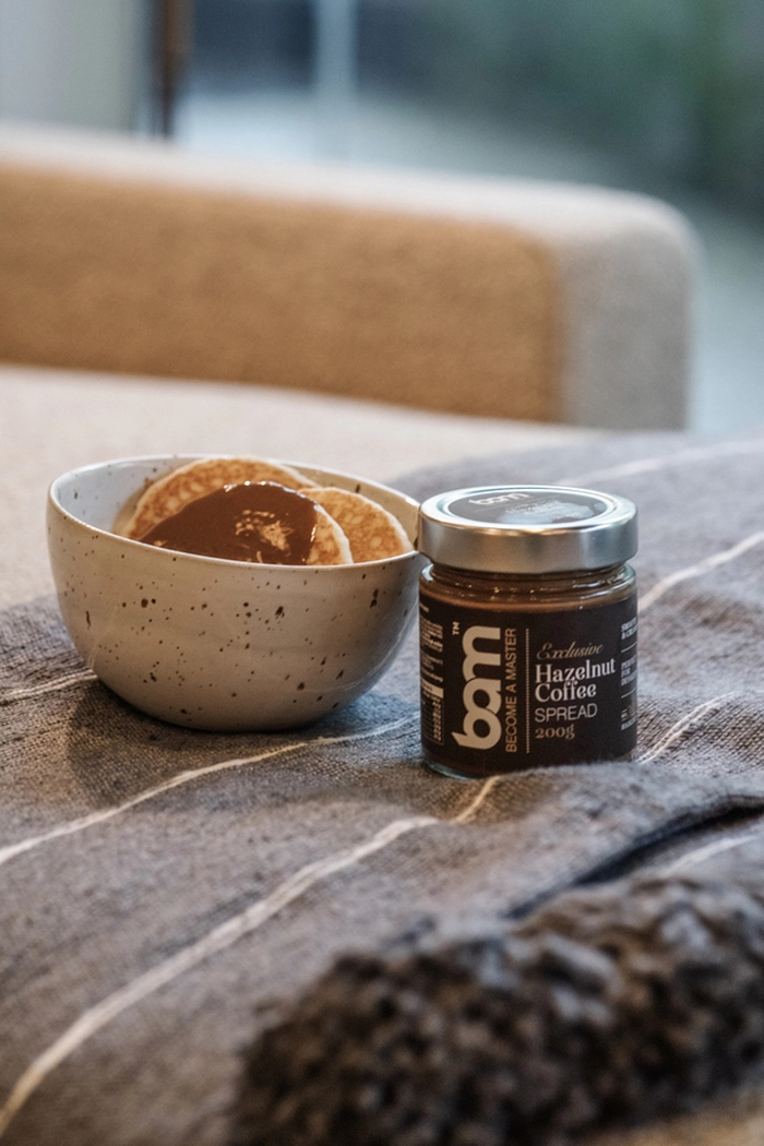 BAM namaz od kave i lješnjaka (200 g) sadrži najmanje 30 % odličnih prženih lješnjaka. Kombinacija paste od lješnjaka, aromatične kave i kremastog mlijeka daje izvrstan, kremasti namaz koji se odmah može uvrstiti u jelovnik. Može dati poseban okus doručku, užini ili večeri, a izvrsno funkcionira i kao dodatak desertima. Namaz ne sadrži palmino ulje, isto tako je i bez glutena, pa svatko tko izbjegava gluten može slobodno posegnuti za njim. BAM namaz od kave i lješnjaka idealan je za pripremu vrhunskih krema i mousseova. Može se dodati kao nadjev u kroasane, pite i druga peciva ili se jednostavno namazati na kruh i palačinke odnosno dodati sladoledu i voću.