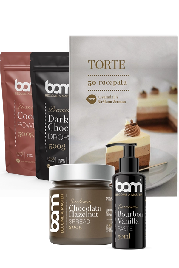 Paket Najbolja čokoladna torta sadrži BAM tamnu čokoladu koja se odlikuje istinskim okusom kakaa i odgovarajućom razinom gorčine. BAM kakao u prahu tople crveno-smeđe boje, BAM čokoladni namaz s lješnjacima, čiji se izuzetan okus lješnjaka divno nadopunjuje s aromatičnim okusom kakaa u prahu i kremastim okusom mlijeka, neizbježna BAM pasta od vanilije koja će očarati svojim bogatim okusom vanilije, opojnim mirisom i pravom aromom. U BAM knjizi recepata: Torte možete pronaći recepte za najsočnije čokoladne torte. Klasičan okus čokoladne torte možete nadograditi i pripremiti čokoladnu tortu s višnjama, zatim čokoladnu tortu s vanilijom, čokoladnu tortu s jagodama ili druge sočne čokoladne slastice.
