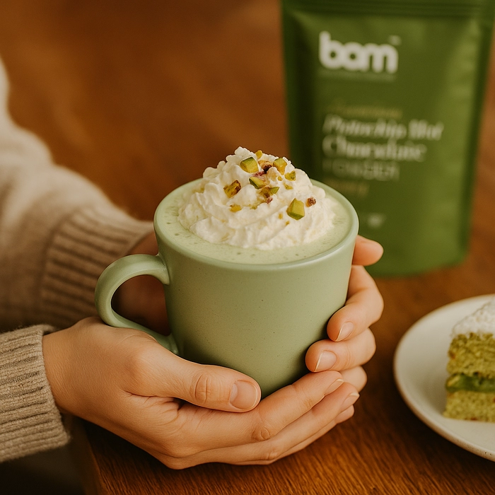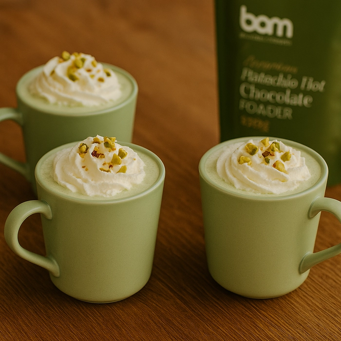BAM Pistacijina topla čokolada (220 g) prava je poslastica za sve koji žele nešto posebno i raskošno. Njezina kremasta tekstura i nježna orašasta aroma savršeno se isprepliću s bogatom čokoladnom bazom te stvaraju napitak koji razmazi sva osjetila i donosi osjećaj topline već pri prvom gutljaju.