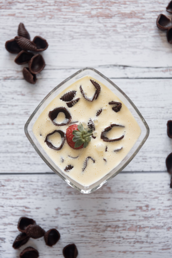 Uzmemo veću staklenu čašu. Na dno čaše stavimo najprije šačicu čokoladne tjestenine, zatim vrećicom za ukrašavanje napunimo čašu do 3/4. Po vrhu kreme rasporedimo još malo čokoladnih školjki koje ćemo posipati zlatnim jestivim praškom, posipamo i kremu. Čaše sa slasticom vratimo natrag u hladnjak, kada se ohladi, slasticu poslužimo.