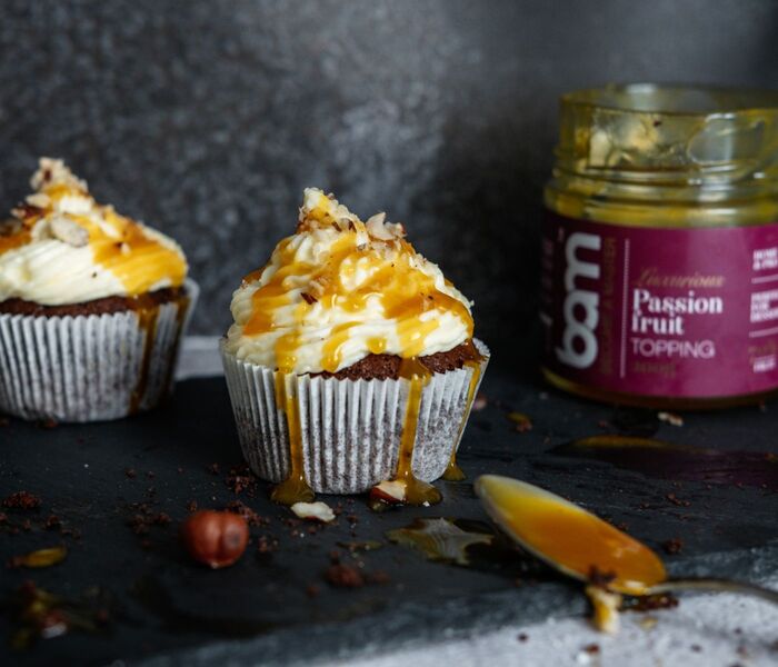 Ohlađene čokoladne muffine izbušite rupicama i napunite ih BAM preljevom od marakuje.