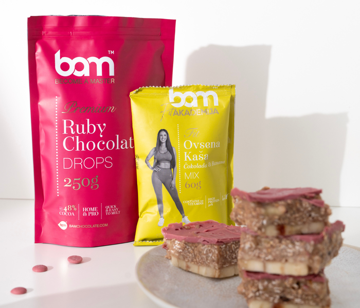 6 Ohlađenu zobenu pločicu prelijte otopljenom rubin čokoladom i ostavite da se čokolada stvrdne. Zatim štanglicu narežite na željene komade i poslužite. Uživajte u ukusnim energetskim zobenim pločicama!