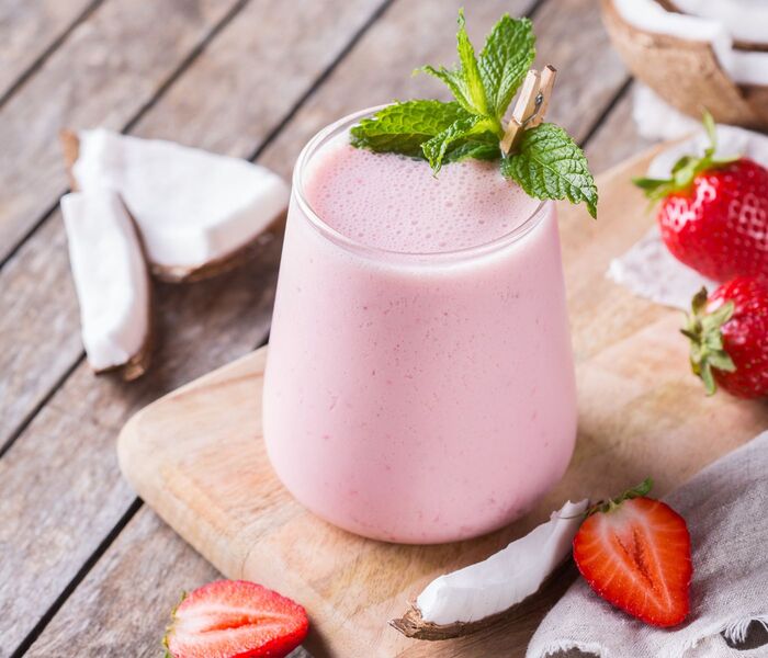 Napitak ulijte u čašu i po želji dodatno ukrasite komadićima jagoda.