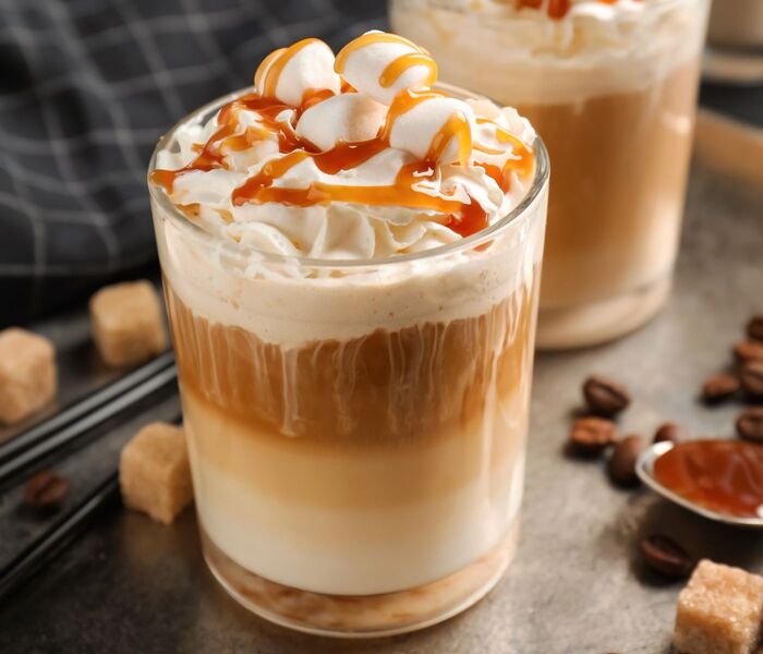 Na vrh kave dodajte tučeno vrhnje i toffee karamel preljev. Po želji, ledenu kavu možete ukrasiti i s nekoliko sitnih šećernih posipa koji će dati dodatnu slatku notu i osigurati estetski izgled napitka.Uživajte u ledenoj kavi s preljevom od karamele!