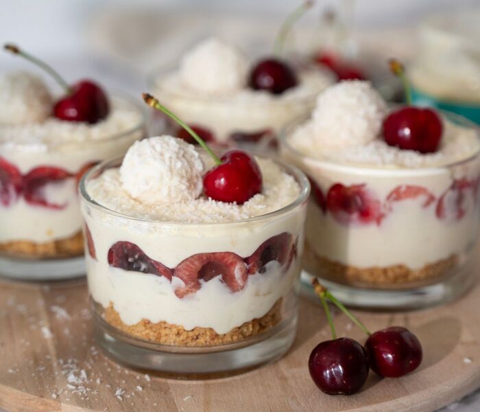 Svaku čašu malo pospite kokosovim brašnom i po želji ukrasite višnjama ili drugim dodacima.